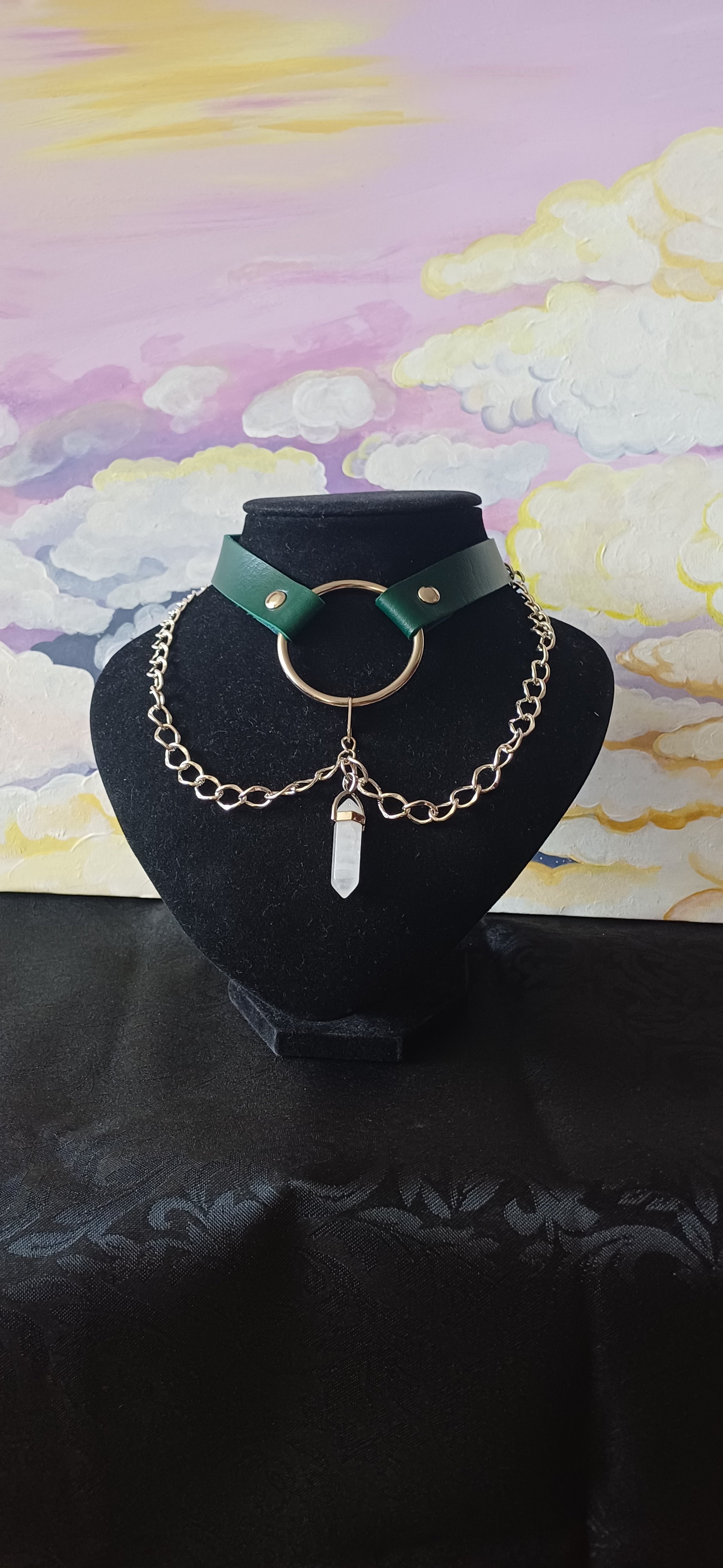 A gorgeous, emerald green choker base with a steel ring, chunky silver plated chains and a clear quartz crystal