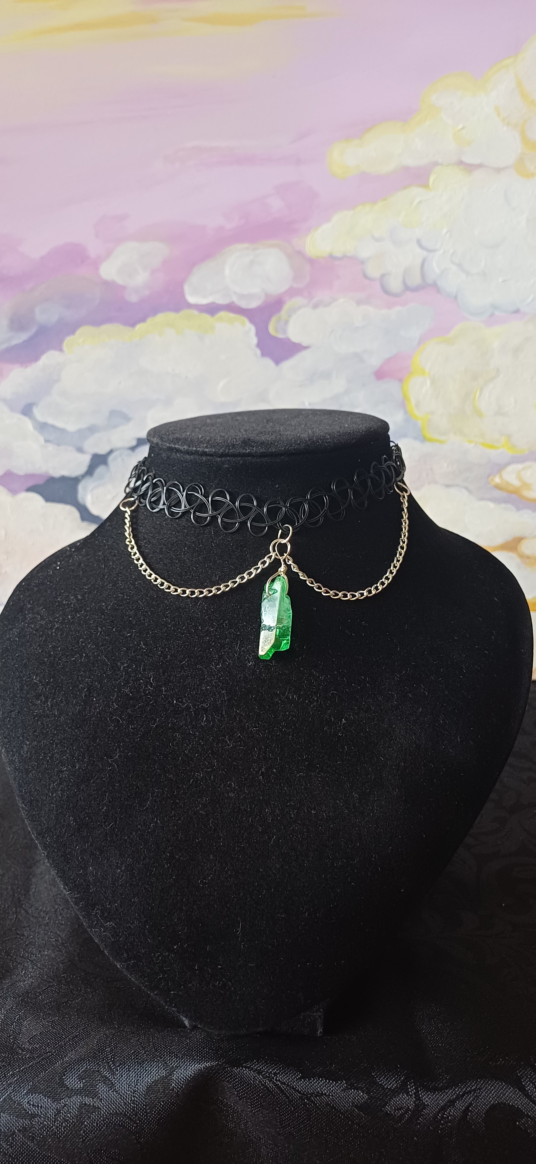 Reaching into the 90s with a twist with this one. This choker is perfect for dressing up a casual outfit. plus this has a green crystal! (Believed to be dyed quartz)