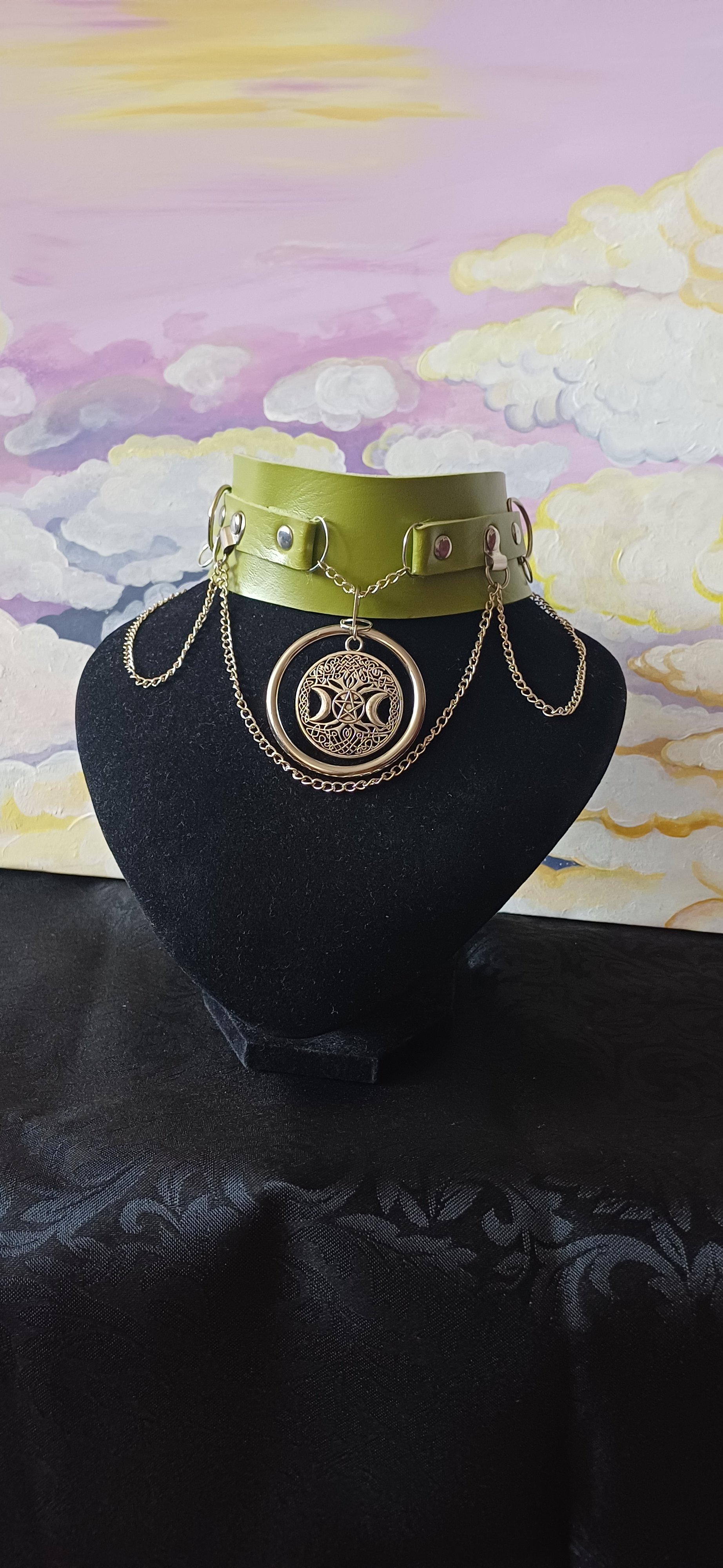 A lime green choker sporting a beautiful tree of life pendant