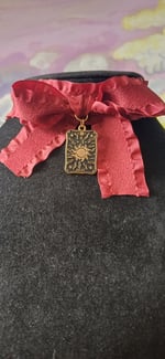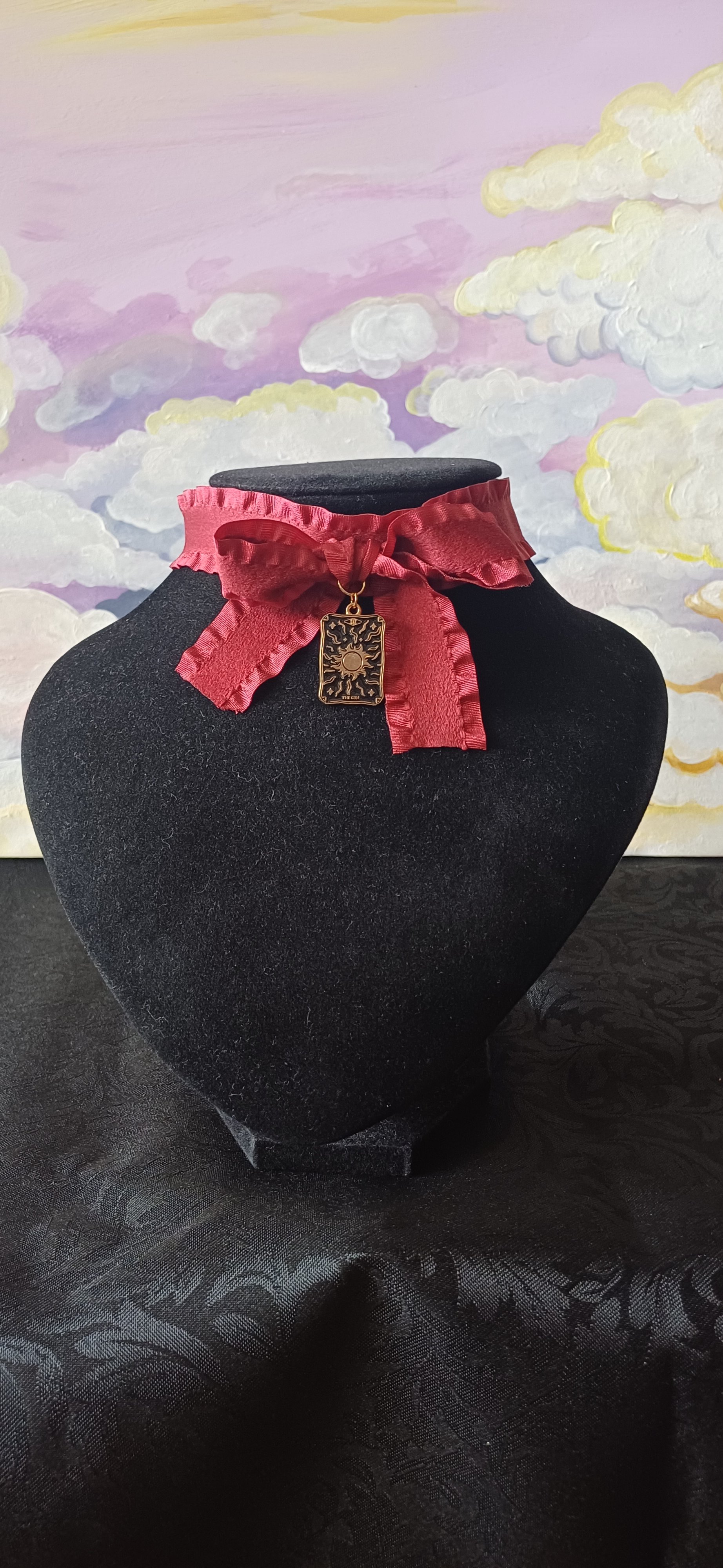 A tarrot themed choker with a red ruffly bow and a slightly rosy gold alloy charm, this choker really is beautiful