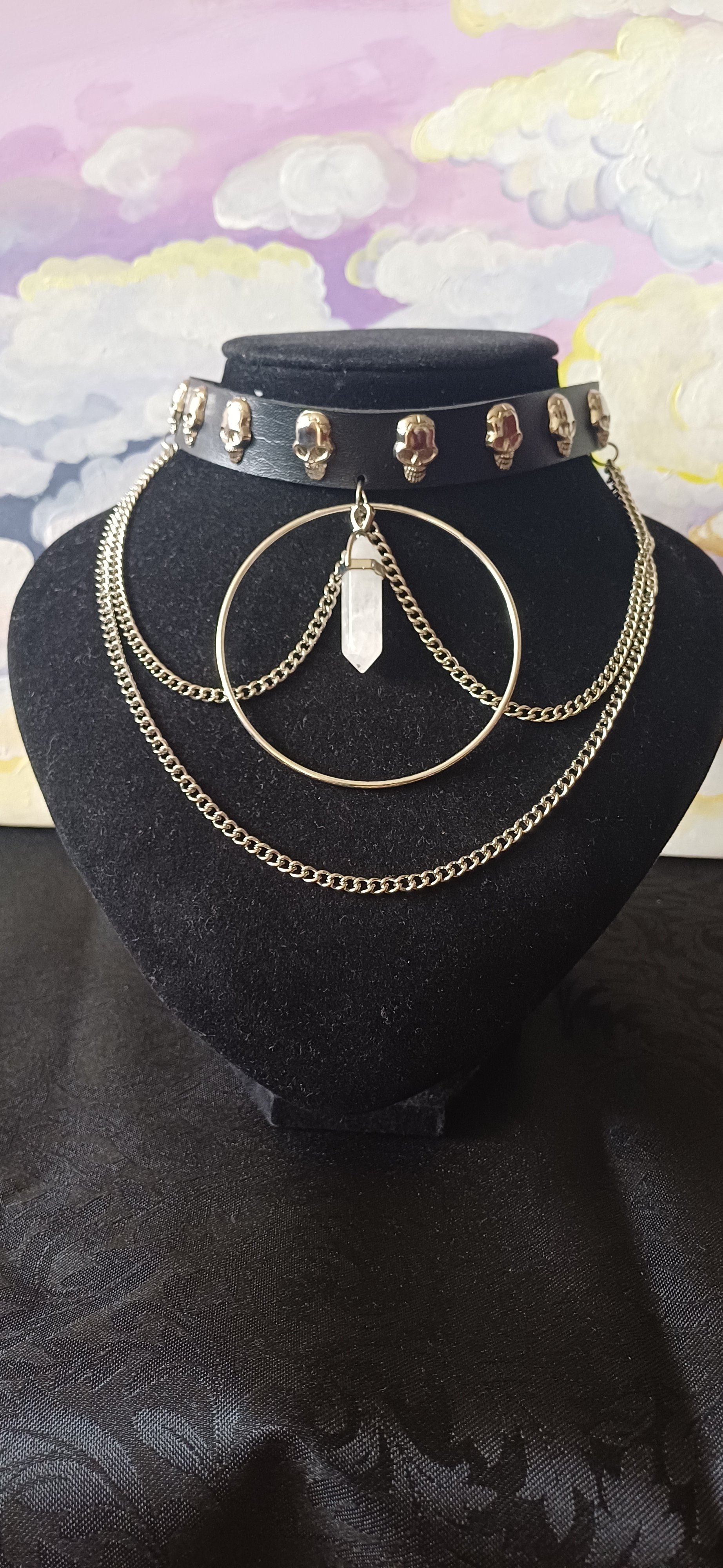 Skull studs and a genuine quartz stone grace this PU leather pendant, with silver plated chain and a matching coloured alloy xl Ring. Dramatic and etheral
